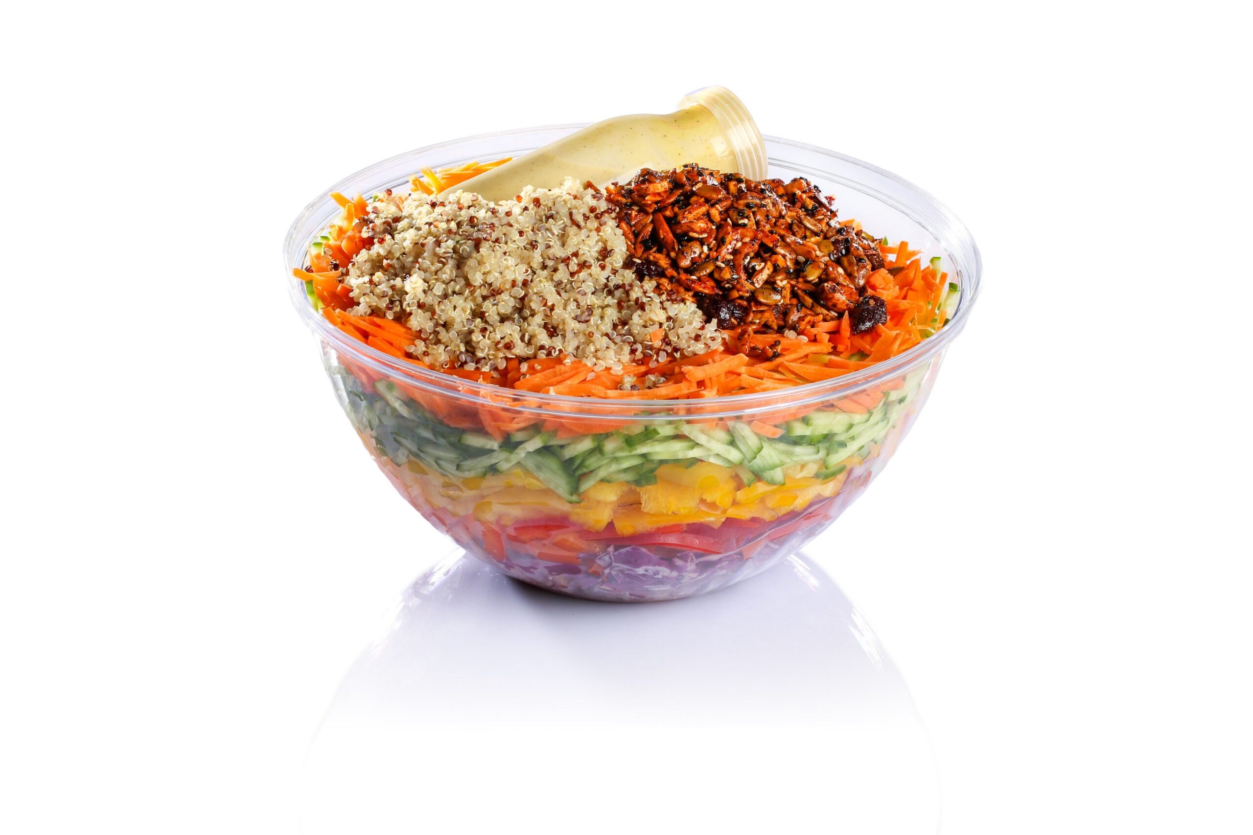 רצועות ירקות בשכבות: מלפפון, פלפל בצבעים, גזר וכרוב/חסה, קינואה, רוטב ויניגרט ומאנצ'יס