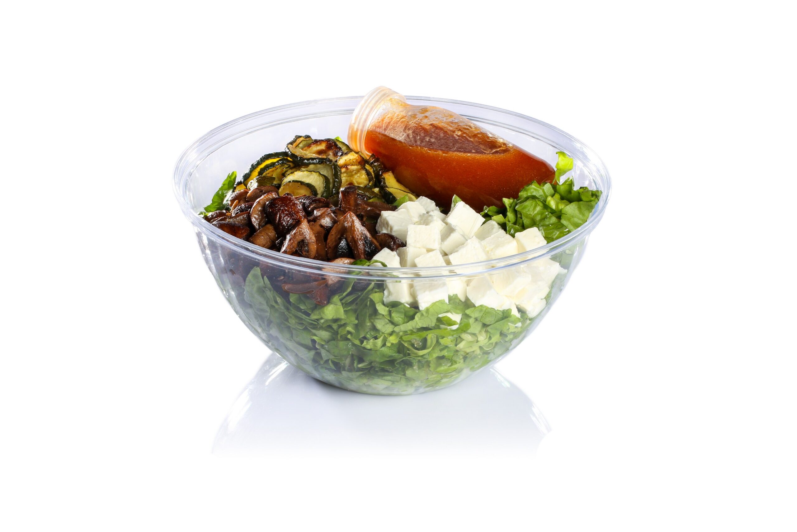 חסה טרייה חתוכה במקום, פרוסות זוקיני צלויות, רבעי פטריות מוקפצות, קוביות גבינה בולגרית ברוטב אסייתי