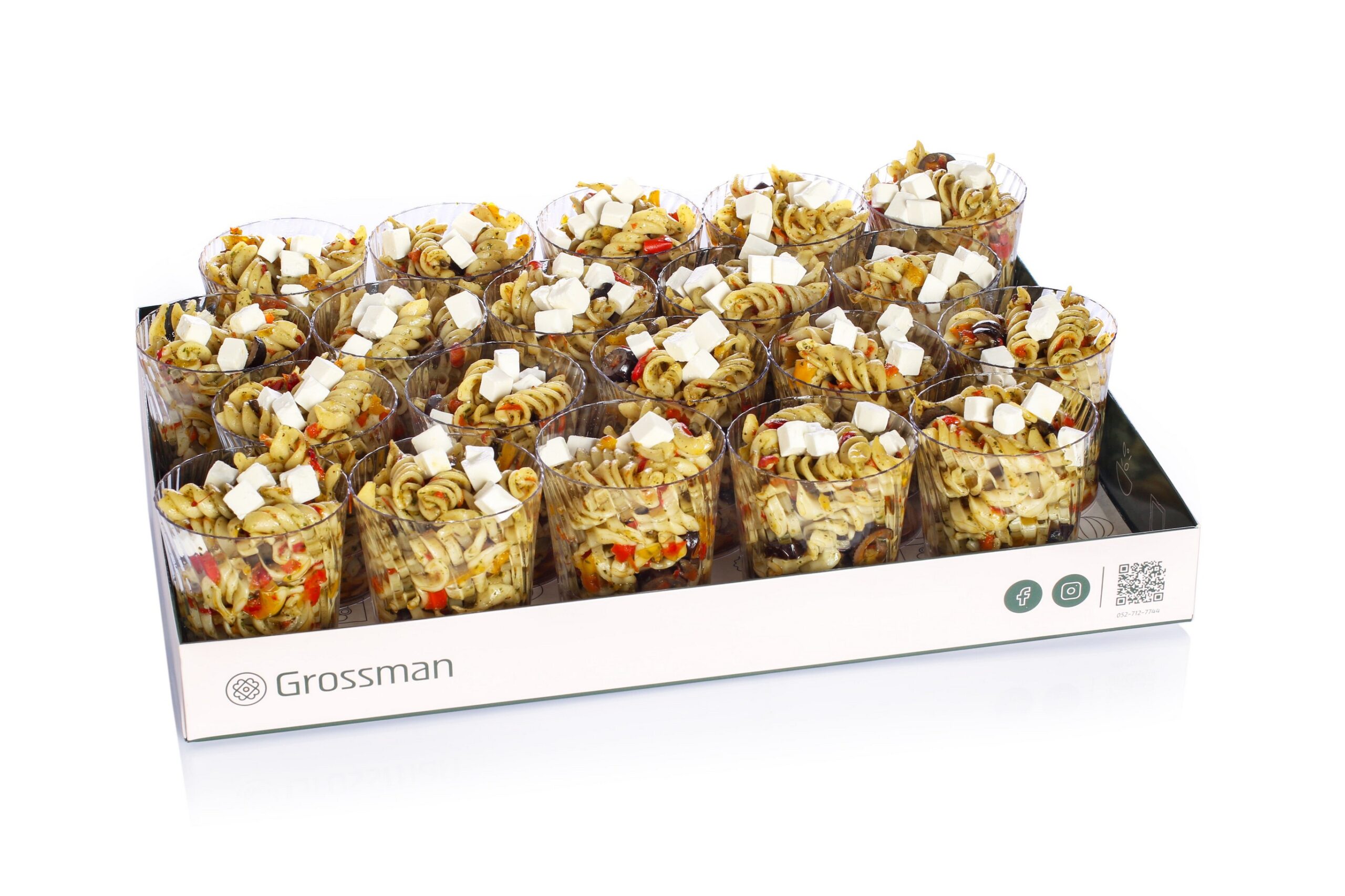 כוסיות פסטה פוזילי, קוביות פלפל קלוי, טבעות זיתים שחורים, רוטב פסטו בזיליקום וגבינה בולגרית