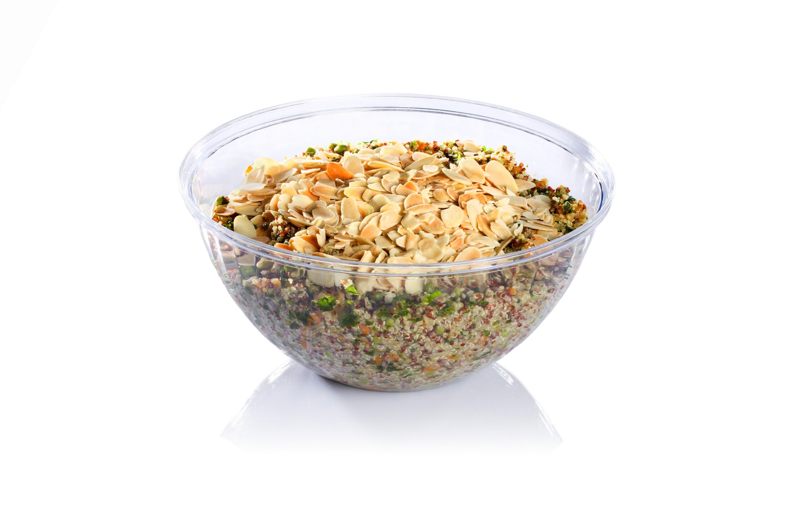 קינואה צבעונית, קוביות דלורית צלויה, אפונת גינה עדינה, שפע עשבי תיבול, חמוציות ושקדים קלויים ברוטב מרענן